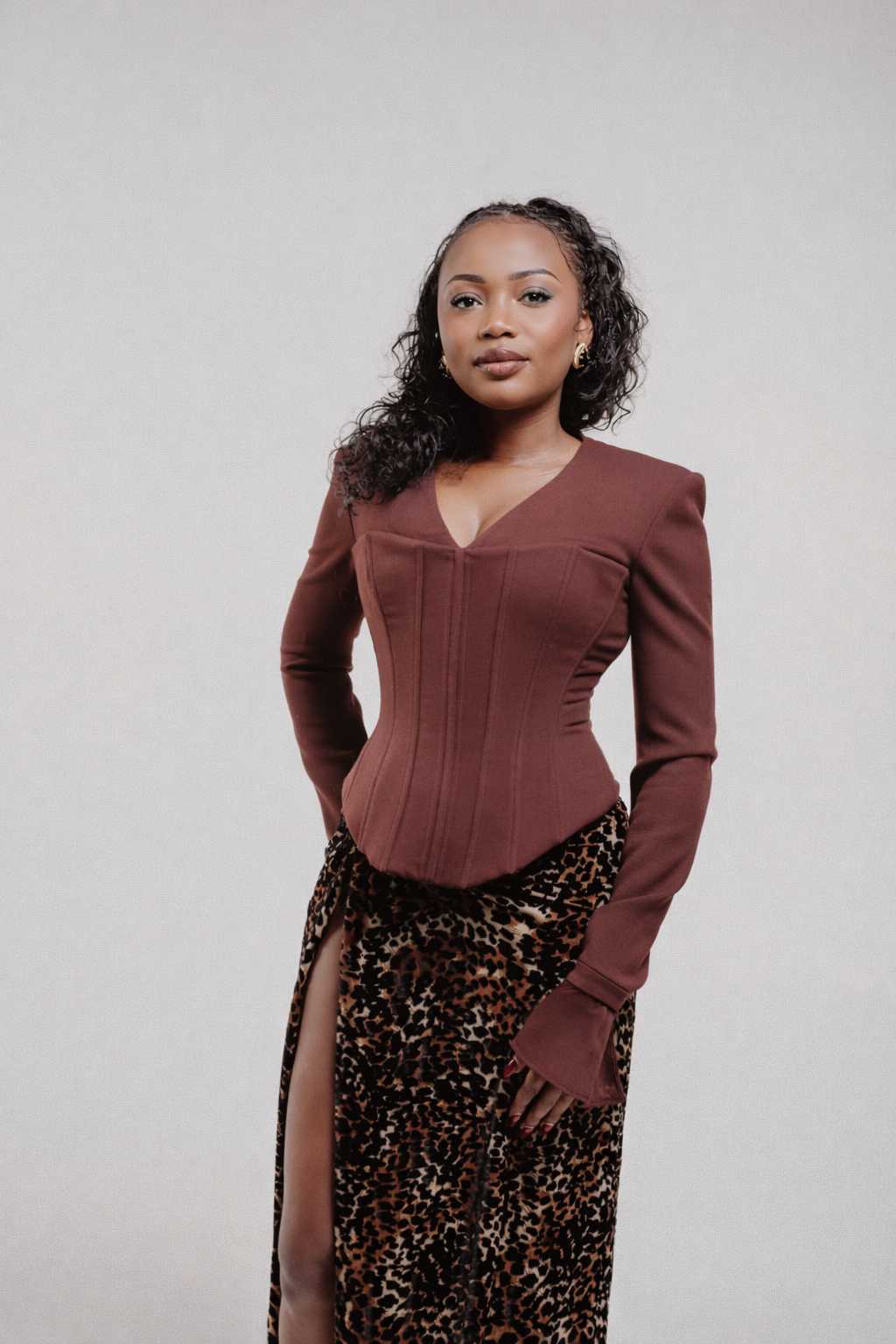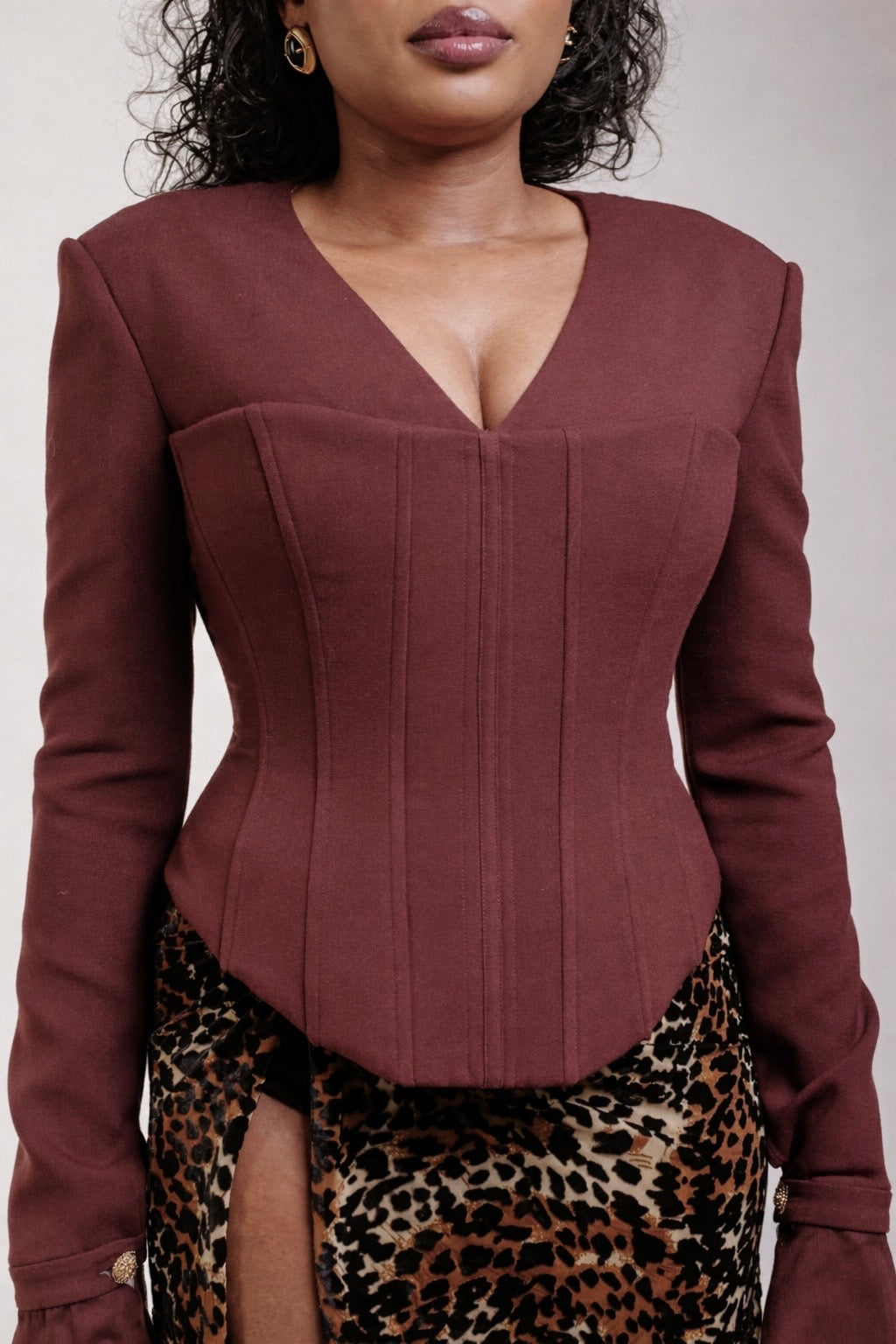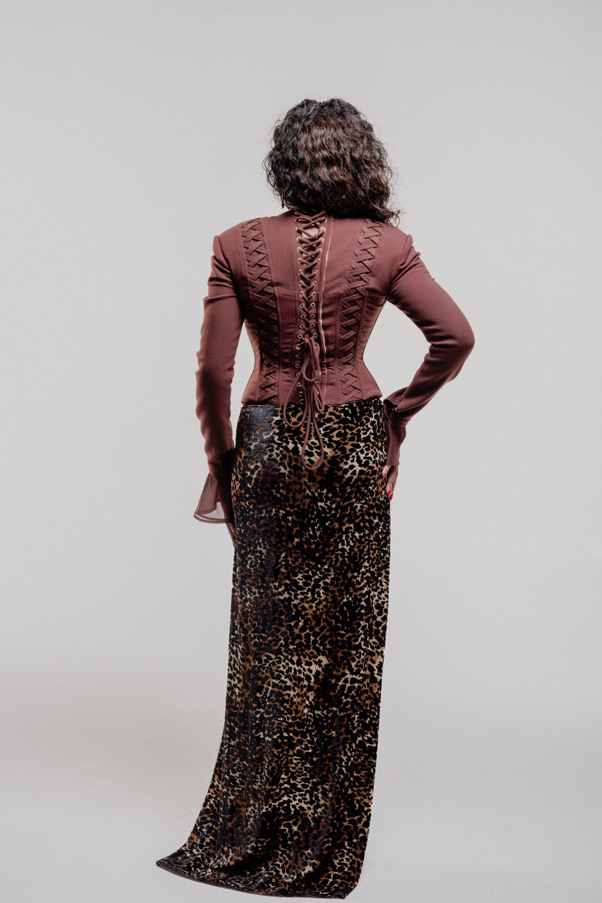 Ce corset à manches longues mêle le charme de l’ancien à une structure contemporaine, conçu pour sculpter et sublimer la silhouette. Le buste cintré évoque un tailoring intemporel, tandis que les manches nettes et les lignes épurées apportent une modernité affirmée.