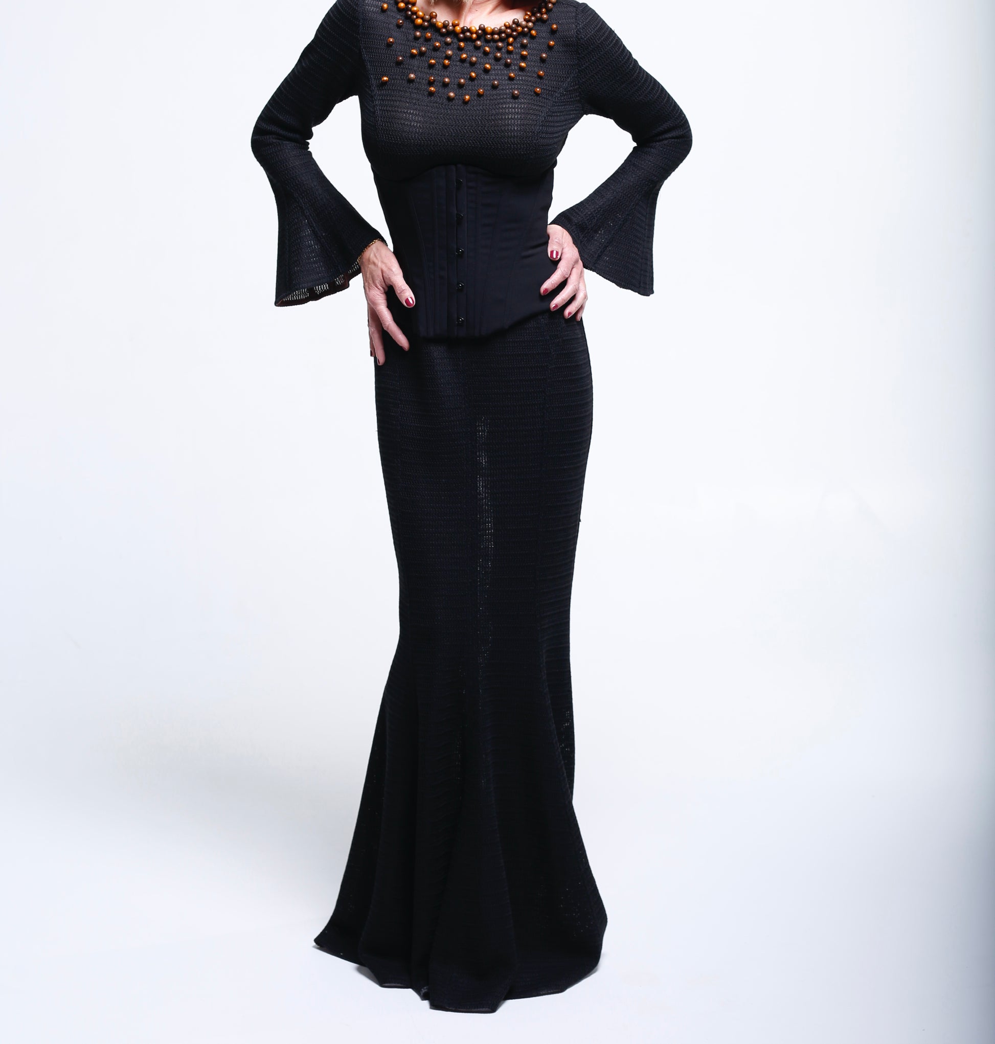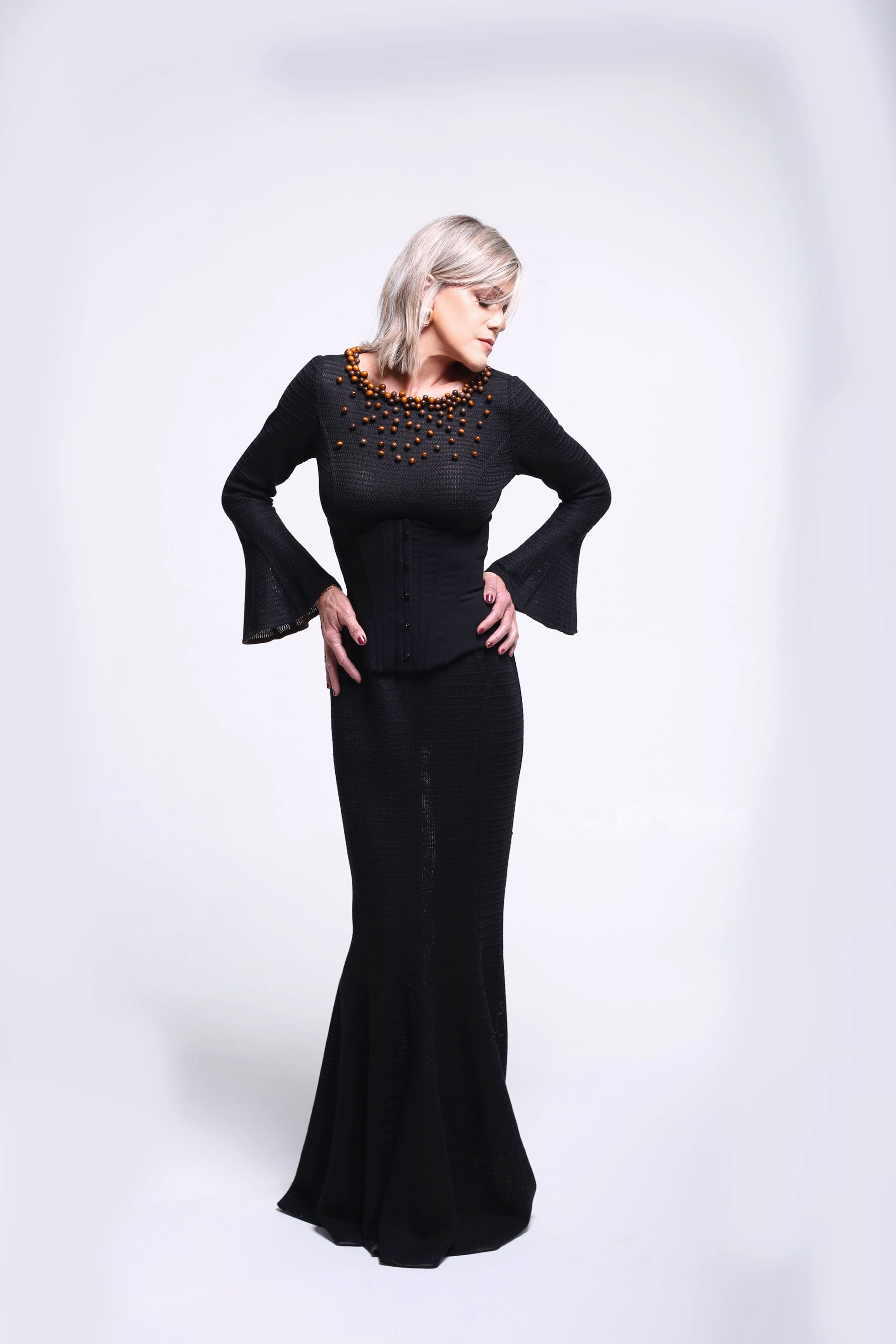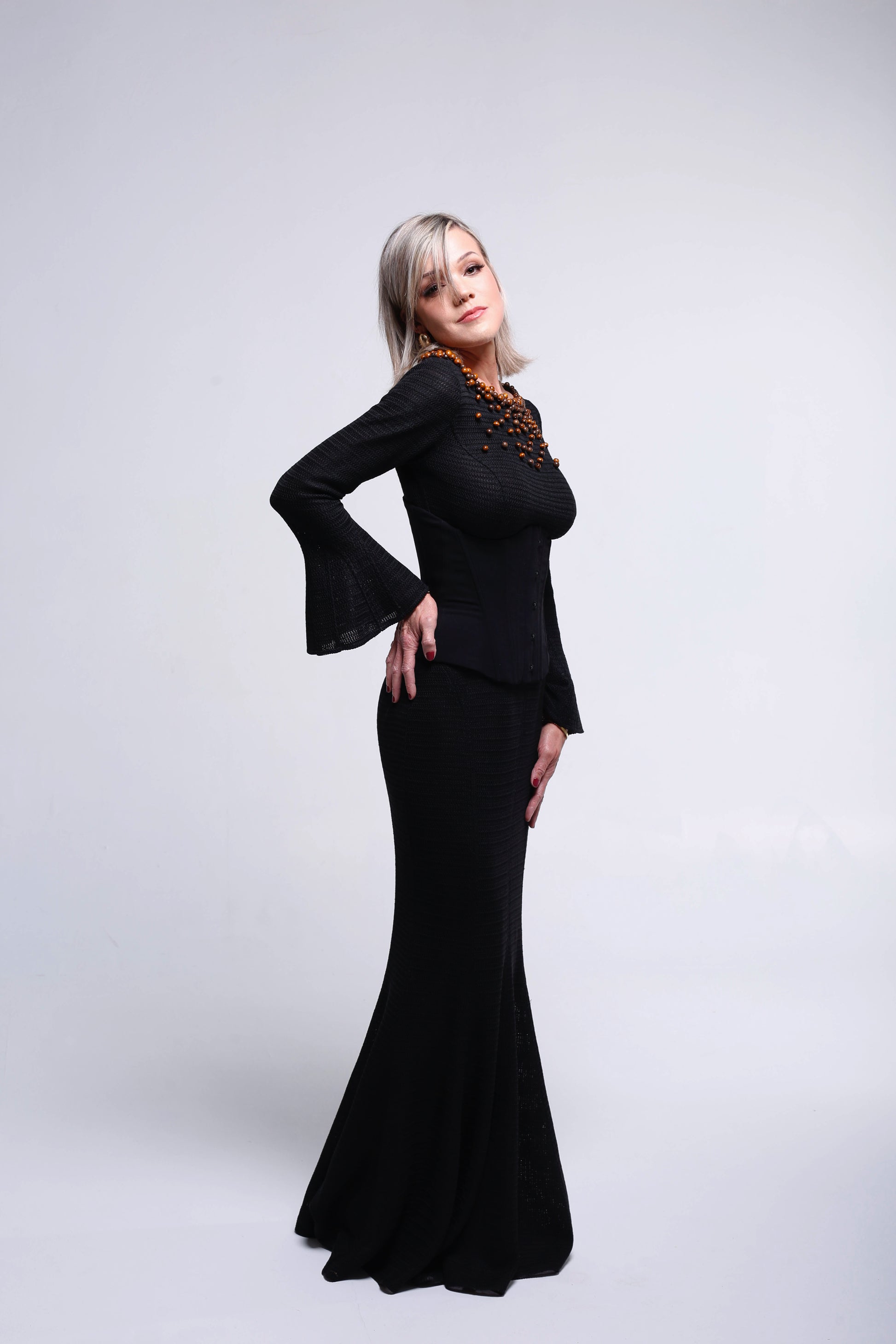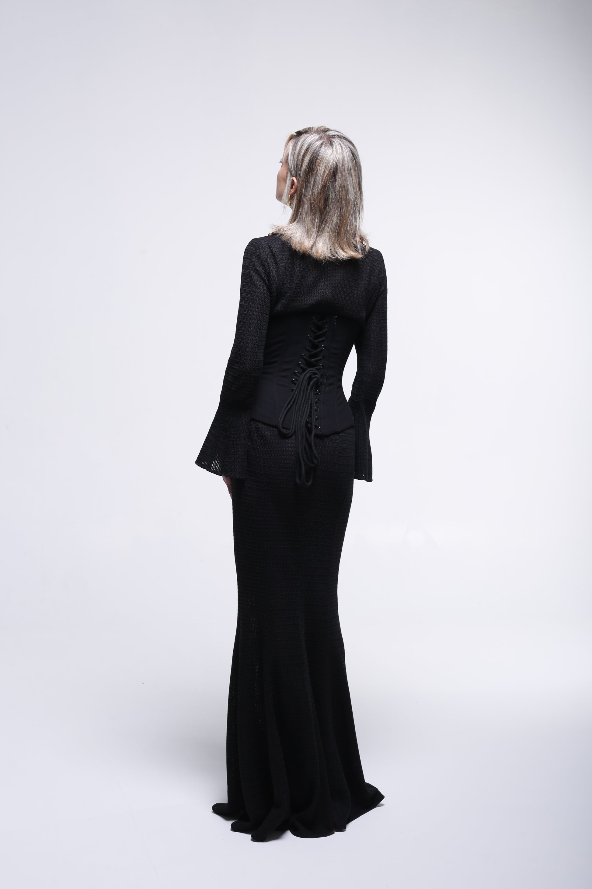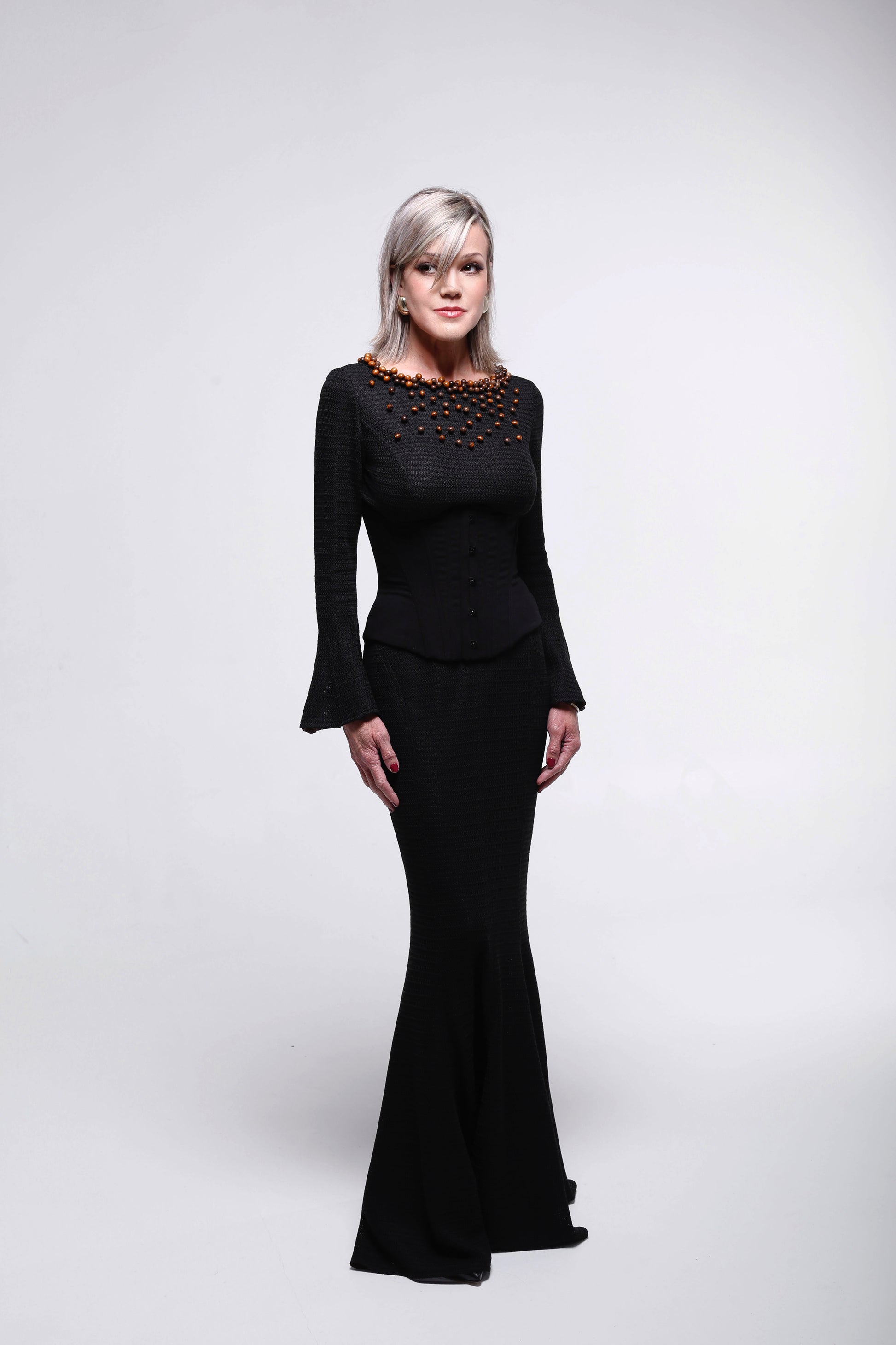 Les manches légèrement évasées et la jupe longue élancent la silhouette, créant une ligne continue, raffinée et intemporelle.