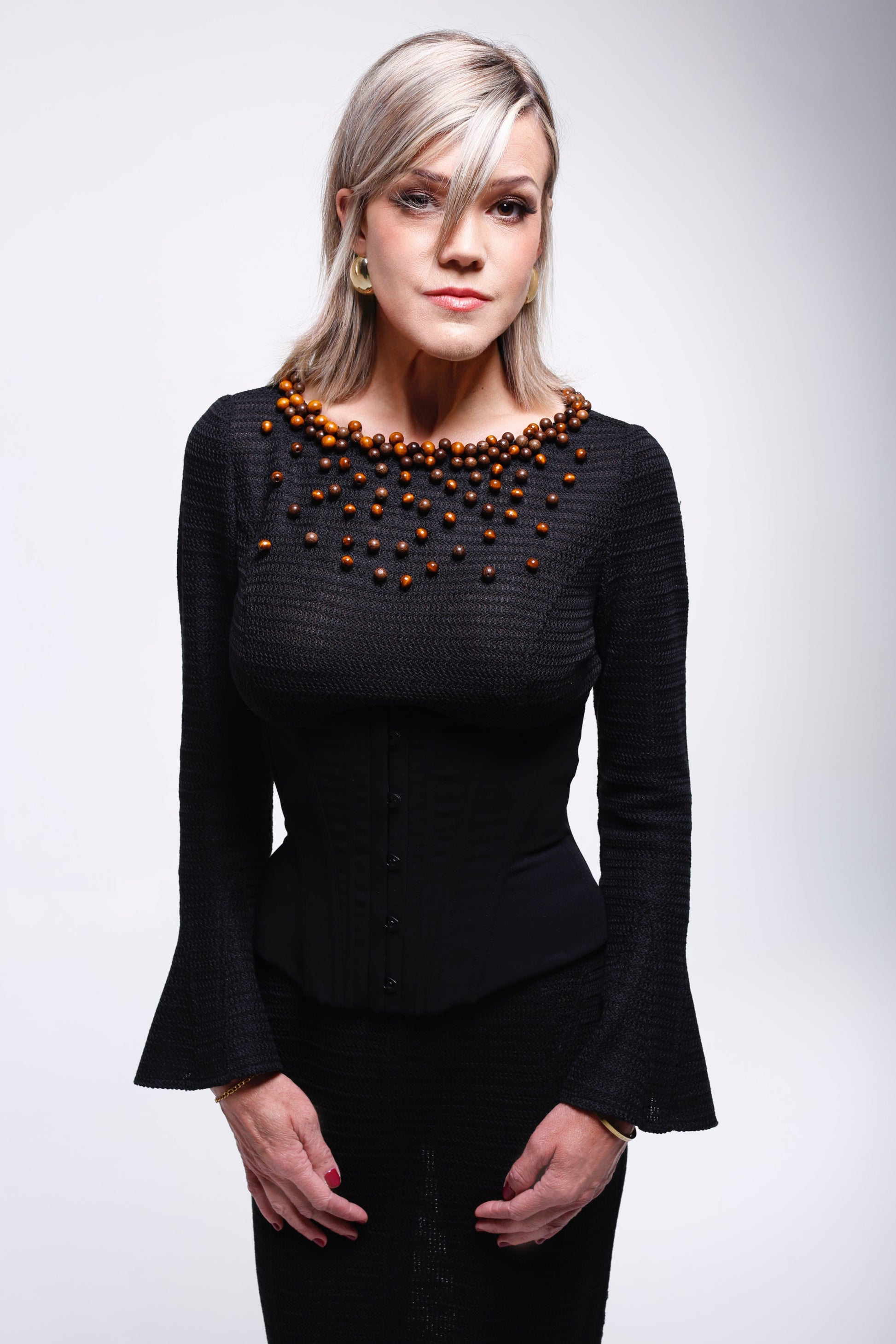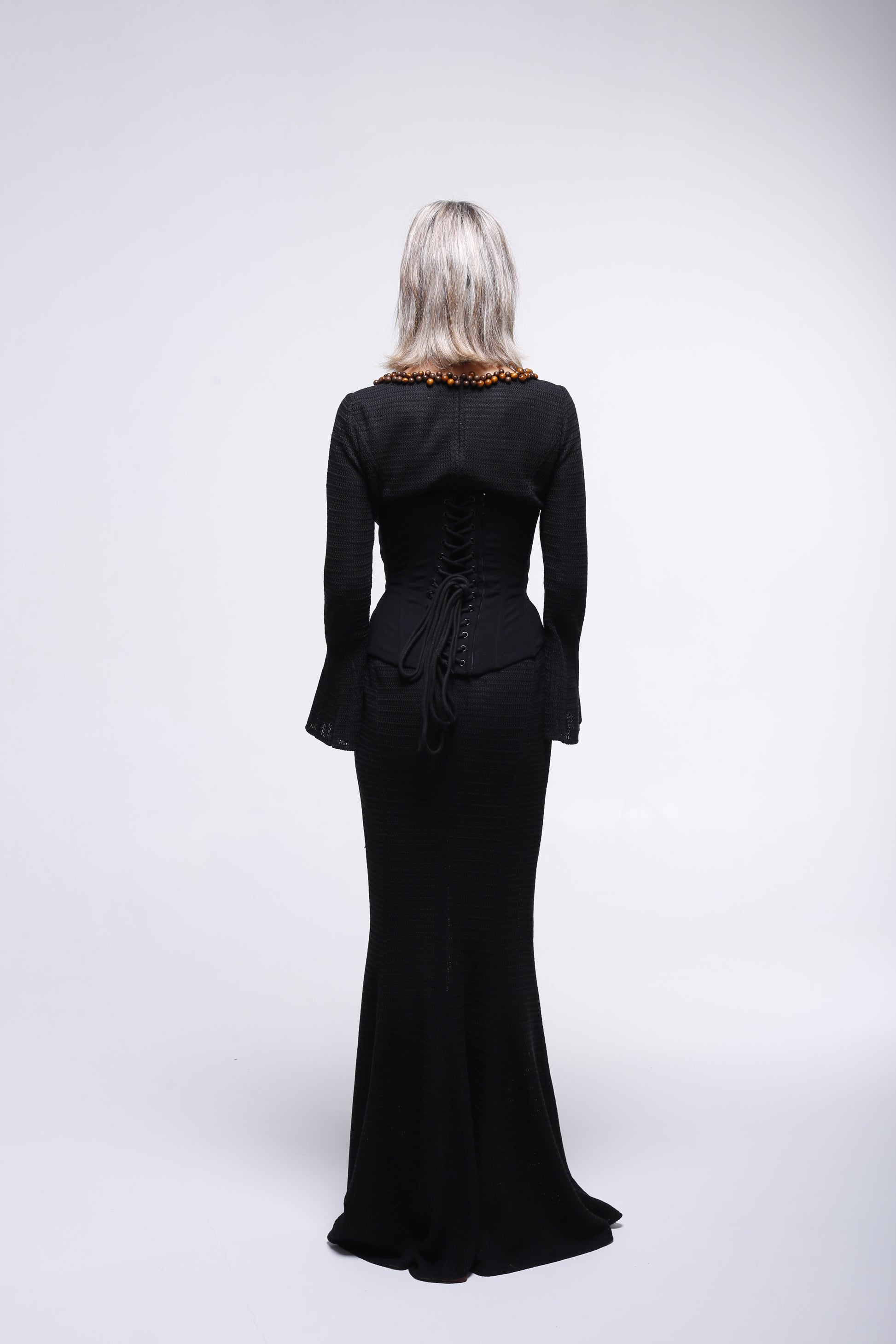 L’encolure est le cœur de la pièce, un travail perlé inspiré des parures d’héritage, réinterprété avec modernité. Les perles ambrées en bois, disposées comme un collier ancestral, évoquent les ornements transmis et portés lors des cérémonies, symbole de mémoire, de féminité et de force silencieuse. Elles apportent une intensité chaleureuse et un caractère profondément culturel au vêtement.